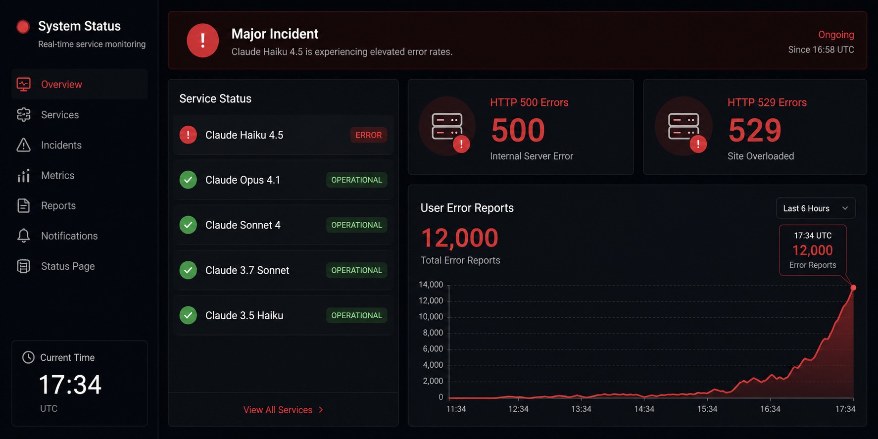 - API de Anthropic: las llamadas a la API devolvían errores 529 (servicio sobrecargado) y en algunos casos 500. Cualquier aplicación que usara Haiku 4.5 en producción quedó afectada.